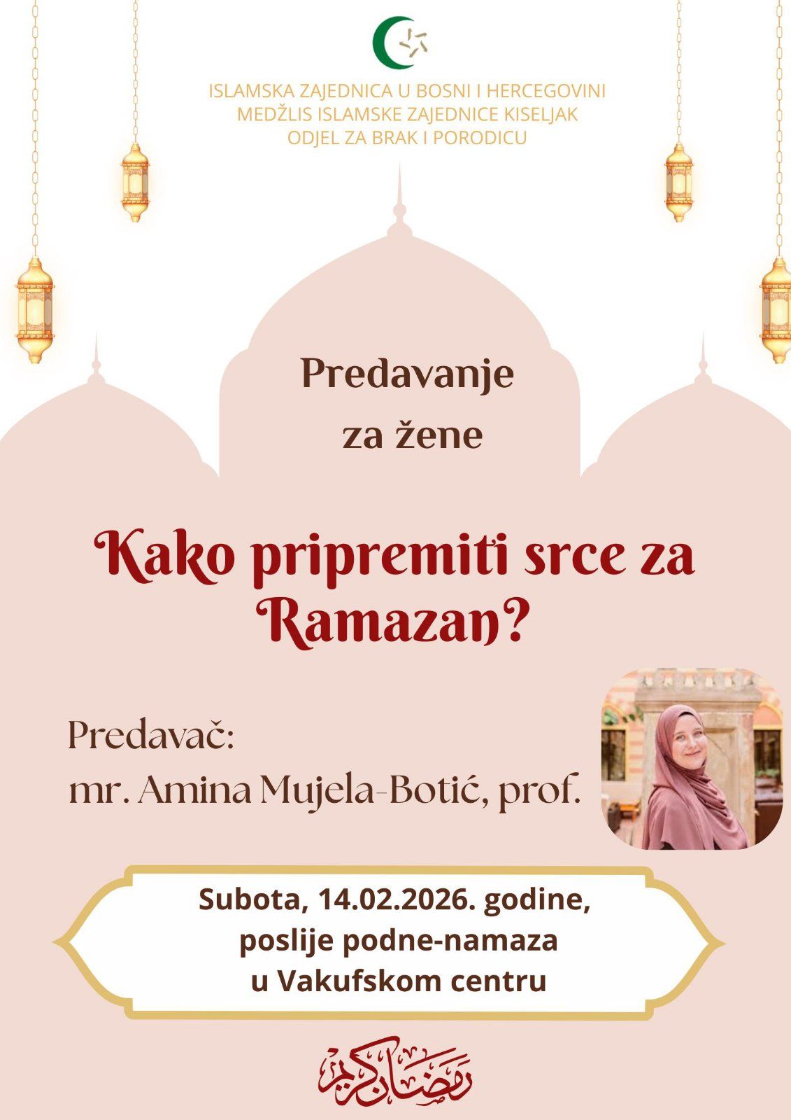 Profesorica Amina Mujela-Botić održala je inspirativno predavanje na temu „Kako pripremiti srce za Ramazan?“. Tom prilikom predstavila je post kroz tri razine – post običnih ljudi, post posebnih ljudi i post posebno posebnih ljudi. Objašnjavajući svaku vrstu na motivirajući način, podstakla je prisutne da ovaj predstojeći Ramazan njihov post bude najuzvišenije vrste – post posebno posebnih ljudi.
