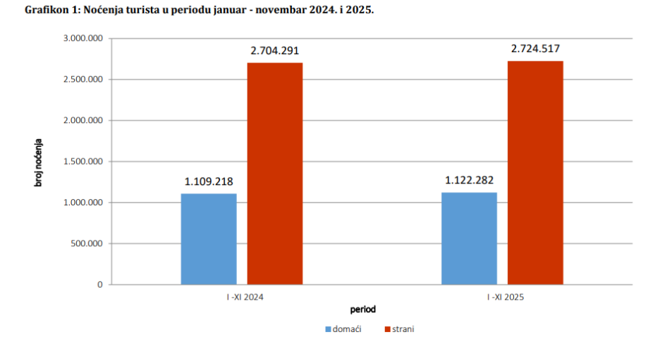 U razdoblju od siječnja do studenog 2025. godine, turisti u Bosni i Hercegovini (BiH) ostvarili su 1.845.242 posjeta, što je za 0,1 posto više u odnosu na isto razdoblje 2024. godine. Istovremeno je zabilježen drastičan pad posjeta turista iz Saudijske Arabije, ali i rast posjeta iz Kine i Hrvatske.