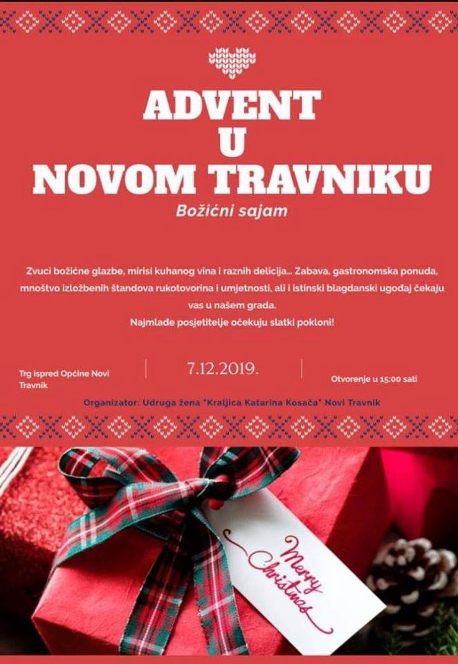 Udruga žena "Kraljica Katarina Kosača" Novi Travnik poziva sve ljude dobre volje na lijepo druženje u blagdanskom raspoloženju. Svi zainteresirani mogu se zabaviti uz kuhano vino, bogatu i ukusnu gastronomsku ponudu, te zanimljive eksponate na uređenim štandovima. Posebna iznenađenja spremaju se za najmlađe.