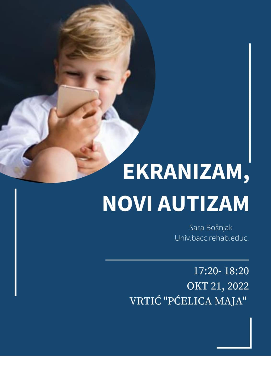 Dječji vrtić "Pčelica Maja" povodom 16.rođendana poziva na predavanje na temu "Ekranizam, novi autizam" od strane edukacijskog rehabilitatora Sare Bošnjak.