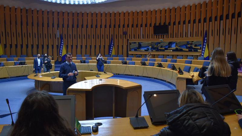 Drugog dana Demokratske akademije, upriličen je posjet Parlamentarnoj skupštini Bosne i Hercegovine gdje je učenike dočekao Zoran Brkić, voditelj njezina Odjela za javnost i medije, koji je ukratko predstavio Ustav Bosne i Hercegovine te početke formiranja nove države Bosne i Hercegovine u poslijeratnom razdoblju. Ovom prigodom, učenici su imali priliku posjetiti dvorane u kojima se odvijaju sjednice Zastupničkog doma i Doma naroda.